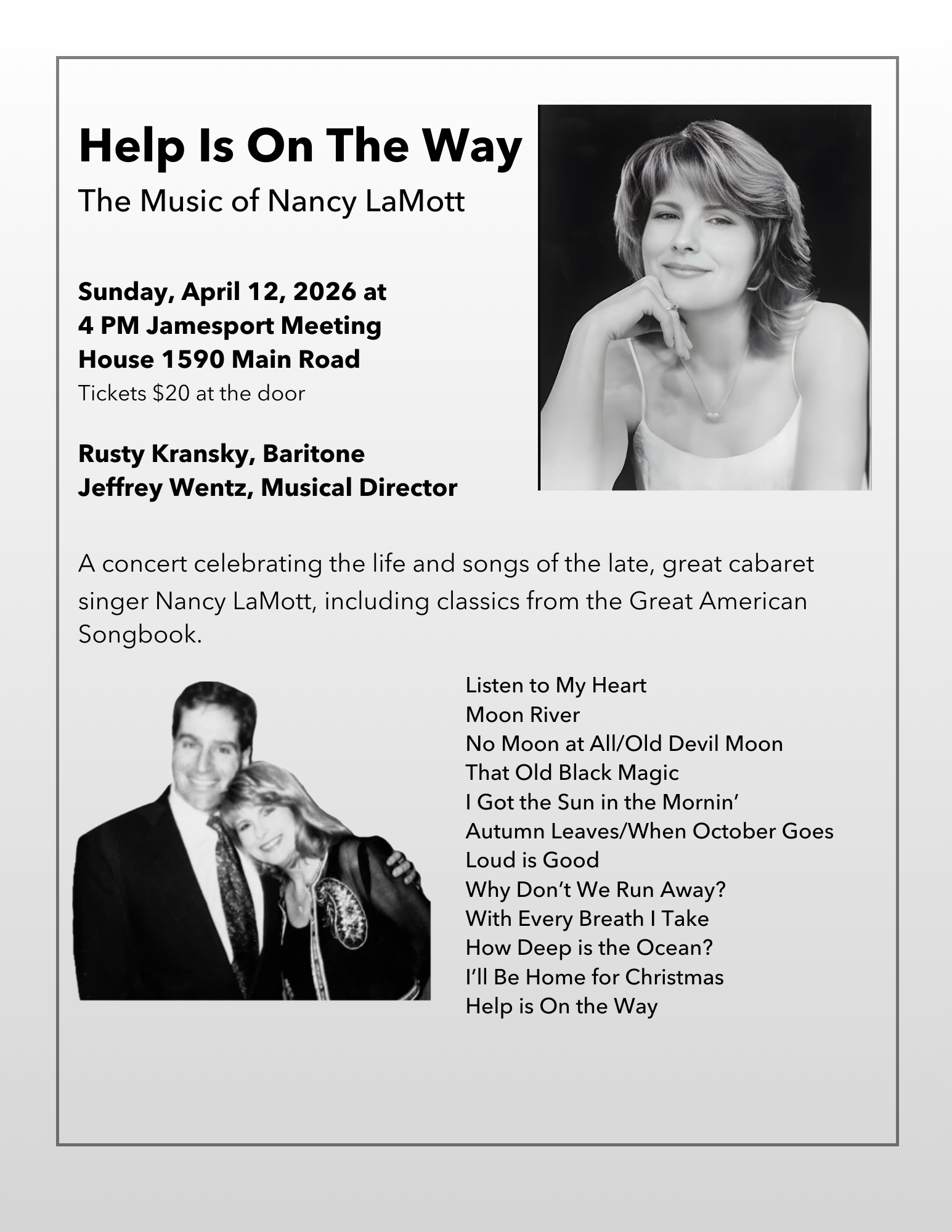 Rusty Kransky will perform “Help is on the Way,” a tribute to the late, great cabaret singer, Nancy LaMott on Sunday, April 12 at 4 p.m. Accompanied by Jeff Wentz at the piano, Rusty will sing songs associated with Ms. LaMott, many using her original arrangements created by her Musical Director Christopher Marlowe. Songs include classics from the Great American Songbook, such as That Old Black Magic and Moon River, show tunes like I’ve Got the Sun in the Morning and Old Devil Moon, and others, all of which were rec