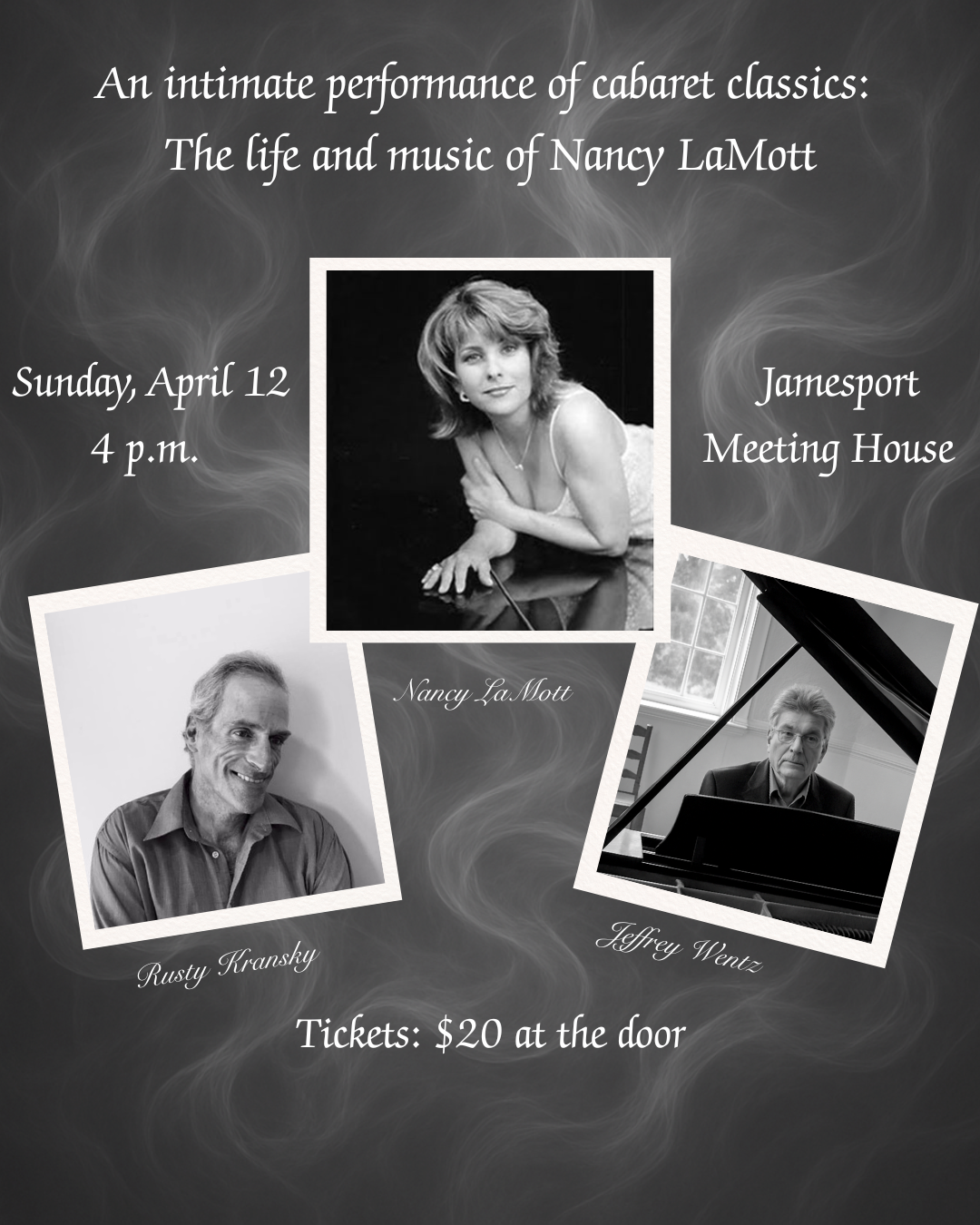 Enjoy an intimate concert of classics from the Great American Songbook on Sunday, April 12, when Rusty Kransky performs a tribute to the late Nancy LaMott, a highly acclaimed cabaret singer who passed in 1995 at age 43. Accompanied by Jeffrey Wentz at piano, Mr. Kransky will sing several of Ms. LaMott’s original arrangements of familiar songs by Harold Arlen, Irving Berlin, David Friedman, Johnny Mercer, Henry Mancini and others, as gifted to him by the cabaret singer’s former musical director, Christopher Marlowe. Mr. Kransky’s performance of these dynamic arrangements will you make you feel as though you’re hearing “Moon River” and “How Deep is the Ocean?” for very first time. Come hear Mr. Kransky perform a heartfelt tribute to his dear friend, Nancy LaMott on April 12 at 4 p.m. at the Jamesport Meeting House. Tickets are $20 and may